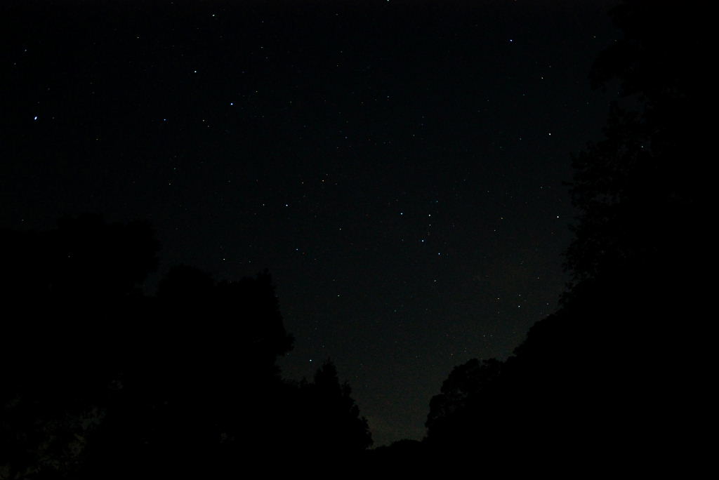 写真左やや下に木の隙間から北極星が写っています。